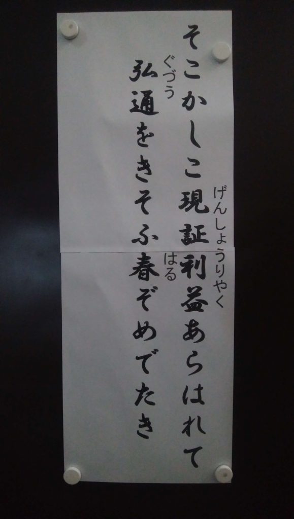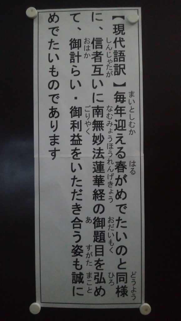 令和5年1月度御教歌 開導日扇上人御教歌 令和5年1月4日 そこかしこ現生利益あらはれて 弘通をきそふ春ぞめでたき 毎年迎える春がめでたいのと同様に、信者互いに南無妙法蓮華経のお題目を 弘めて、御計らい・御利益をいただき合う姿も誠にめでたいものであります