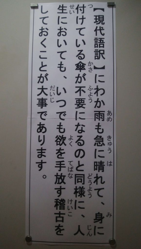 令和5年6月度 日扇上人御教歌 開導日扇上人御教歌 令和5年6月3日 御教歌 村雨の 降るとは見えて 晴れにけり 其の身のかさを そこにぬげおけ 現代語訳 にわか雨も急に晴れて、身についている傘が不要になるのと同様に、人生においても、いつでも欲を手放す稽古をしておくことが大事であります。