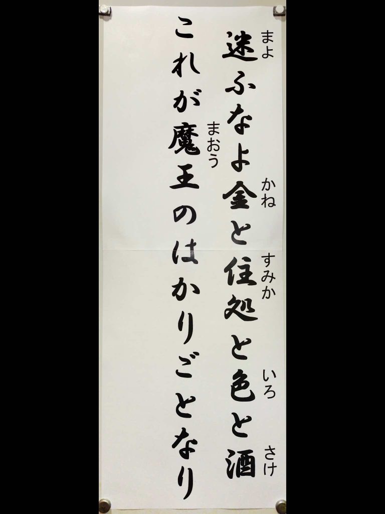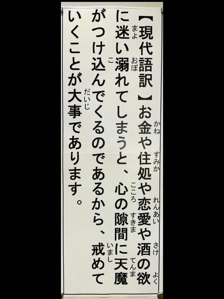 令和6年4月度 開導日扇上人御教歌 開導日扇上人御教歌 令和6年4月4日 御教歌 迷ふなよ 金と住処と 色と酒 これが魔王の はかりごとなり 現代語訳 お金や住処や恋愛や酒の欲に迷い溺れてしまうと、心の隙間に天魔がつけ込んでくるのであるから、戒めていくことが大事であります。