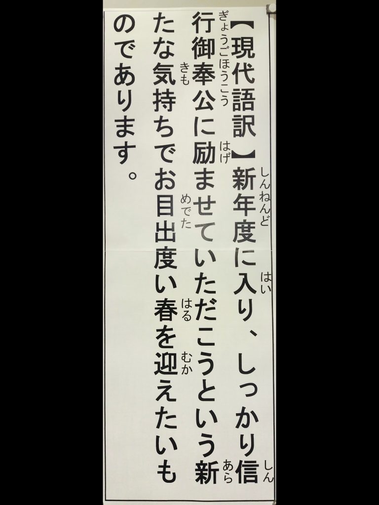 令和7年1月度 開導日扇上人御教歌 開導日扇上人御教歌 令和7年1月3日 御教歌 新しき 年もろともに 信行の 改まり行く 春ぞ目出度き 現代語訳 新年度に入り、しっかり信行御奉公に励ませていただこうという 新たな気持ちでお目出度い春を迎えたいものであります。